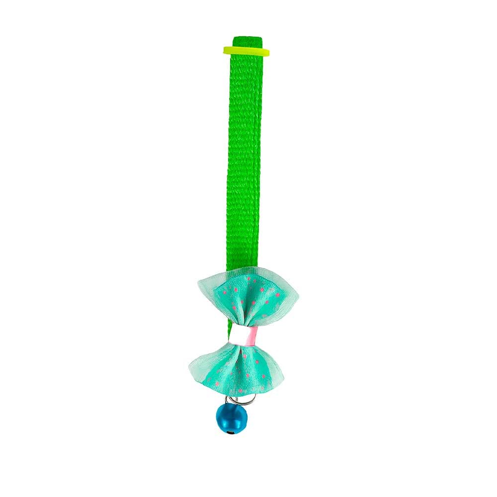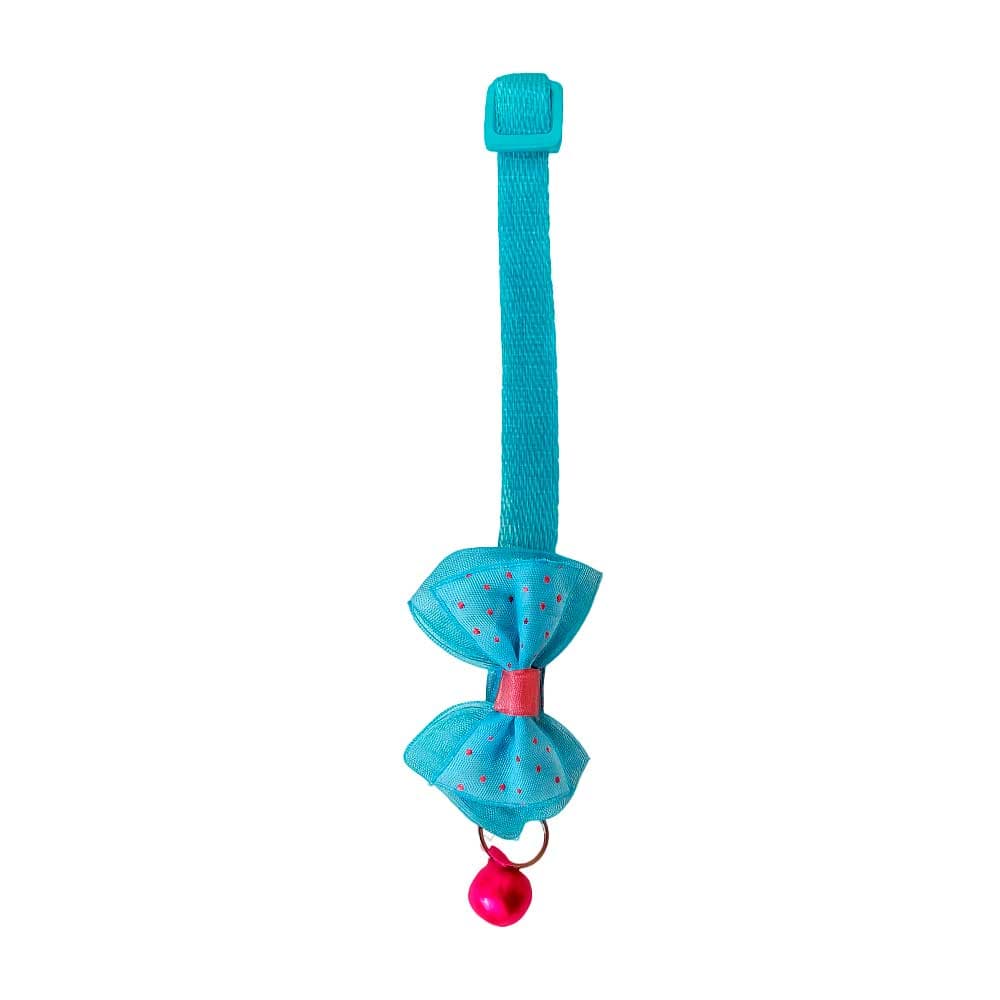 Collar ajustable para gato en color celeste con elegante moño y cascabel rosa. Cómodo, seguro y perfecto para gatos pequeños, medianos y grandes.